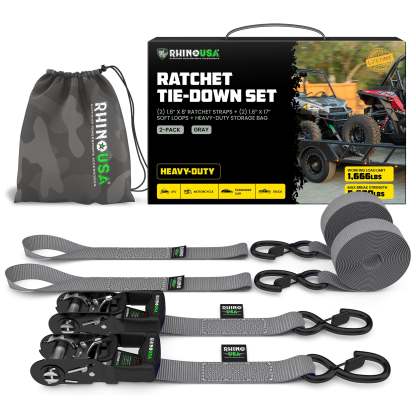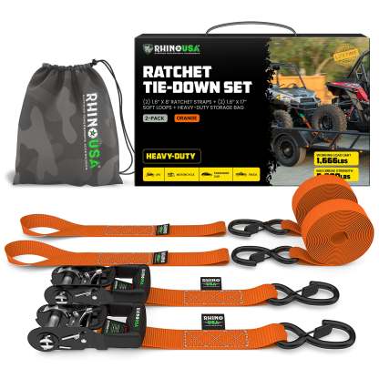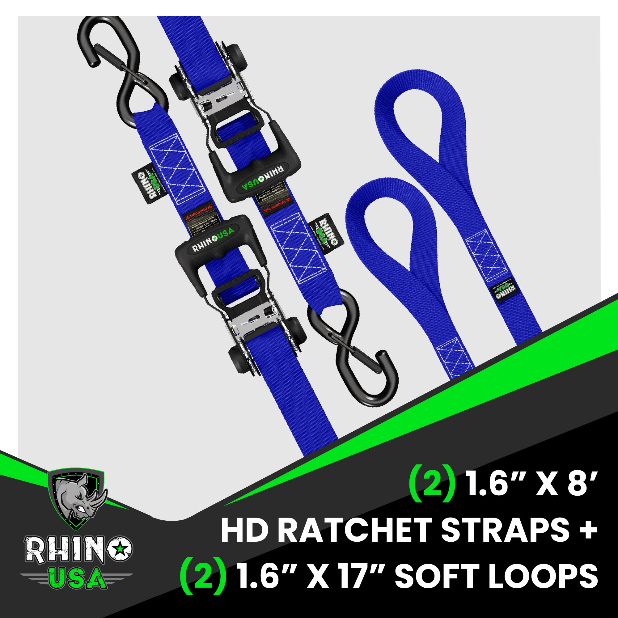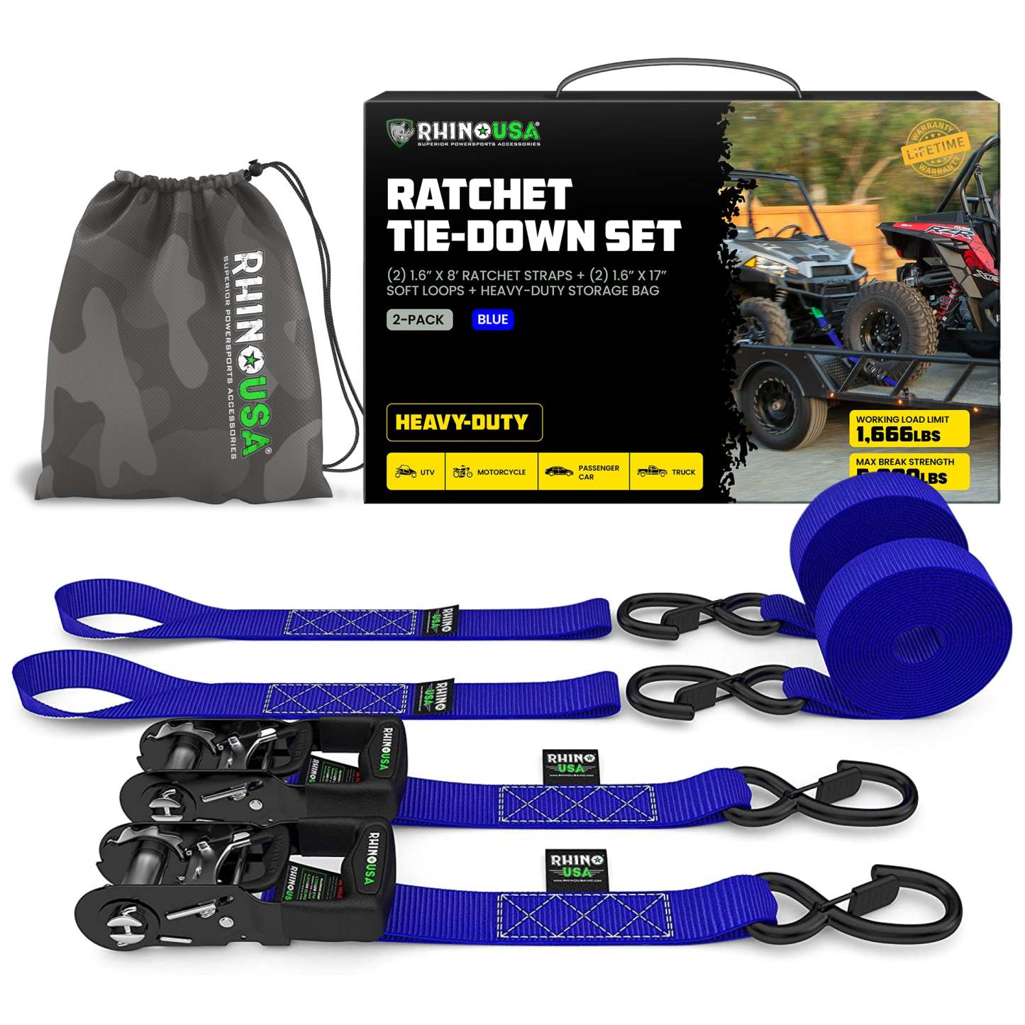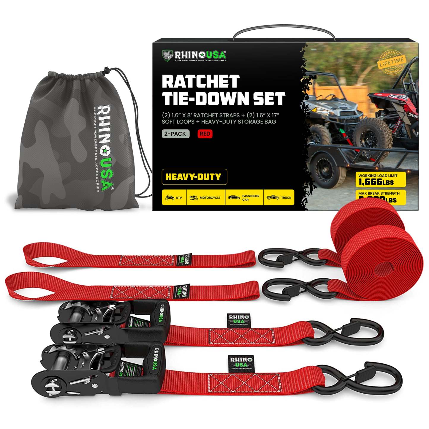 - RATCHET STRAPS HEAVY DUTY TIE DOWN SET, 5,208 BREAK STRENGTH - (2) Heavy Duty 1.6" x 8' Cargo Tiedowns with Padded Handles & Coated Chromoly S Hooks + (2) Soft Loop Tie Downs Strap